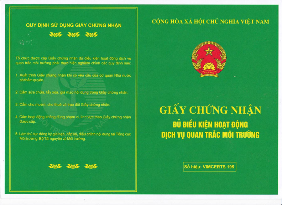 Đủ điều kiện hoạt động dịch vụ quan trắc môi trường theo phạm vi chứng nhận tại Phụ lục kèm theo.
